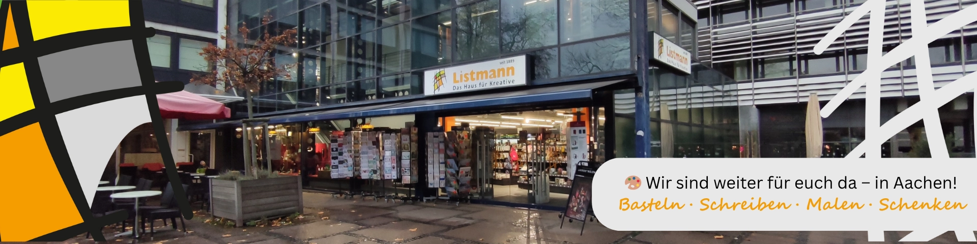 Dein Lieblingsgeschäft für Schreibwaren, Künstler- & Bastelbedarf sowie Handarbeiten, Papeterie und Geschenke - Exklusiv im Herzen von Aachen. Bei uns findest Du persönlichen Service, sorgfältig ausgewählten Kunstbedarf und jede Menge kreative Inspiration. Sei es Hobby- oder Studio-Qualität, unser erfahrenes Fachpersonal berät dich gerne bei der Auswahl des richtigen Materials. Lass dich inspirieren und verwirkliche dein nächstes Kunstwerk.