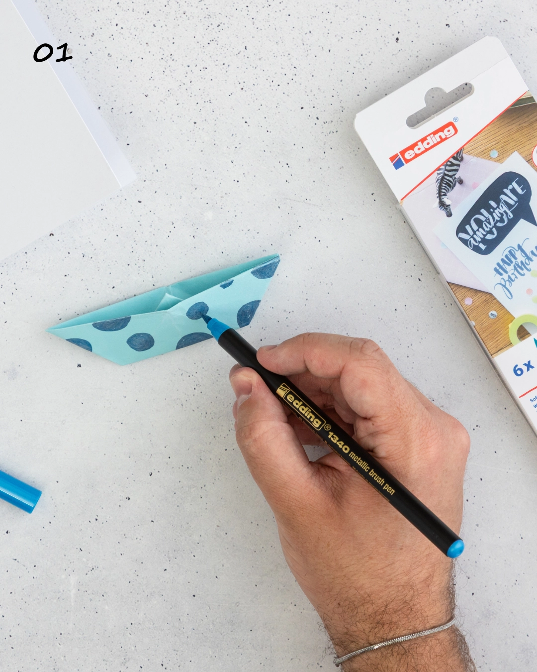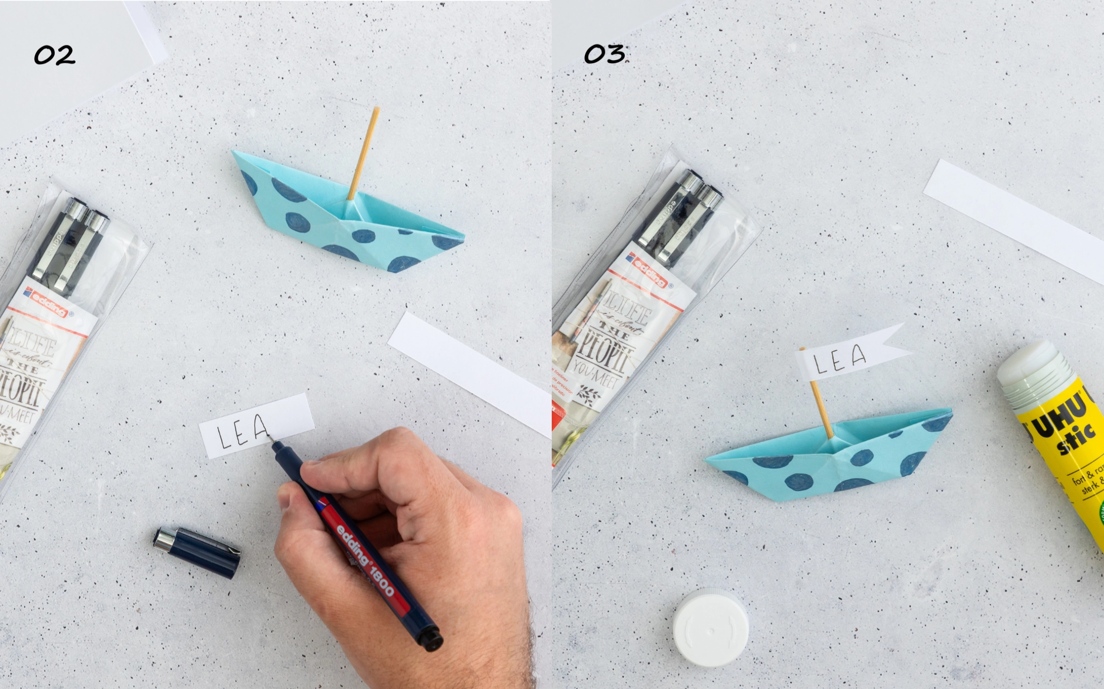 Falte ein kleines Schiffchen aus Papier und male dieses an. Hier ein paar Anregungen: