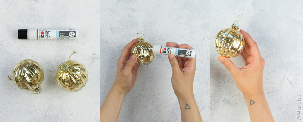 - Bepunkte deine Deko (hier die Christbaumkugeln) beliebig mit dem Marabu Dot Pen. Bedenke dabei, dass die Farbe erhaben trocknet für den 3D Effekt.
