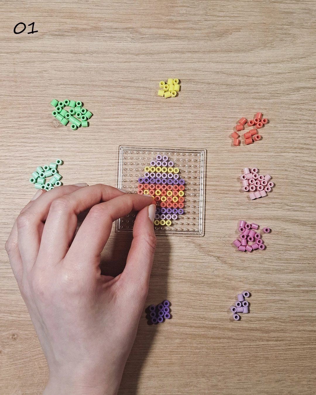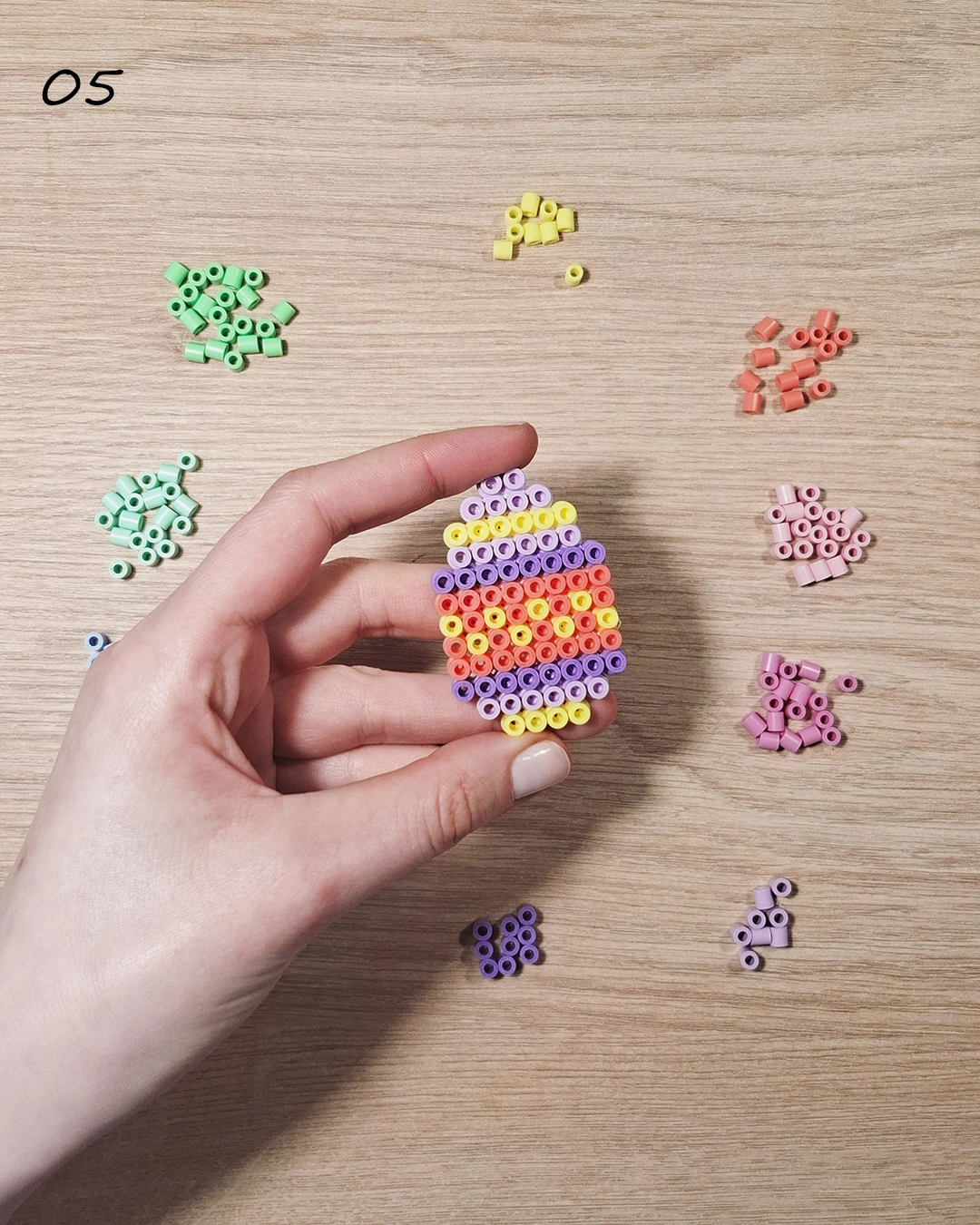 01-02) Stecke die Bügelperlen auf der Stiftplatte zu einem Osterei zusammen. Du kannst dafür unsere Vorlagen verwenden oder deiner Kreativität freien Lauf lassen.