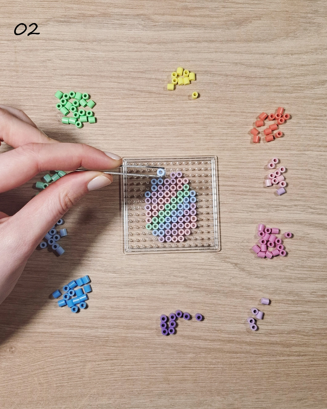 03) Lege etwas Bügel- oder Backpapier auf dein Motiv und bügle vorsichtig in kleinen Kreisbewegungen darüber, bis die Perlen etwas angeschmolzen sind. Am besten testest du erstmal bei mittlerer Temperatur und machst das Bügeleisen etwas heißer, wenn das noch nicht so gut funktioniert.