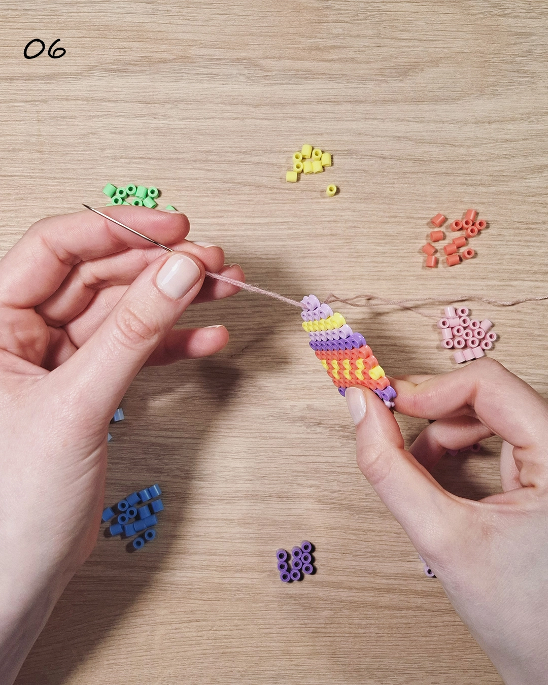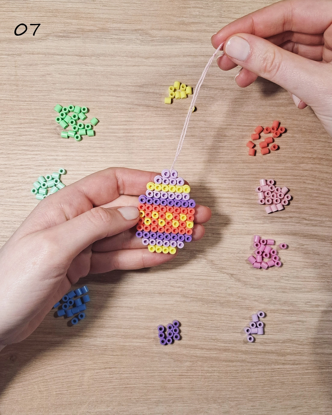 06-07) Ziehe mit einer Sticknadel ein ca. 20 cm langes Stück Bindfaden, Stickgarn oder Band deiner Wahl durch den oberen mittleren Zwischenraum der Perlen und verknote die Enden, damit du die Ostereier aufhängen kannst.