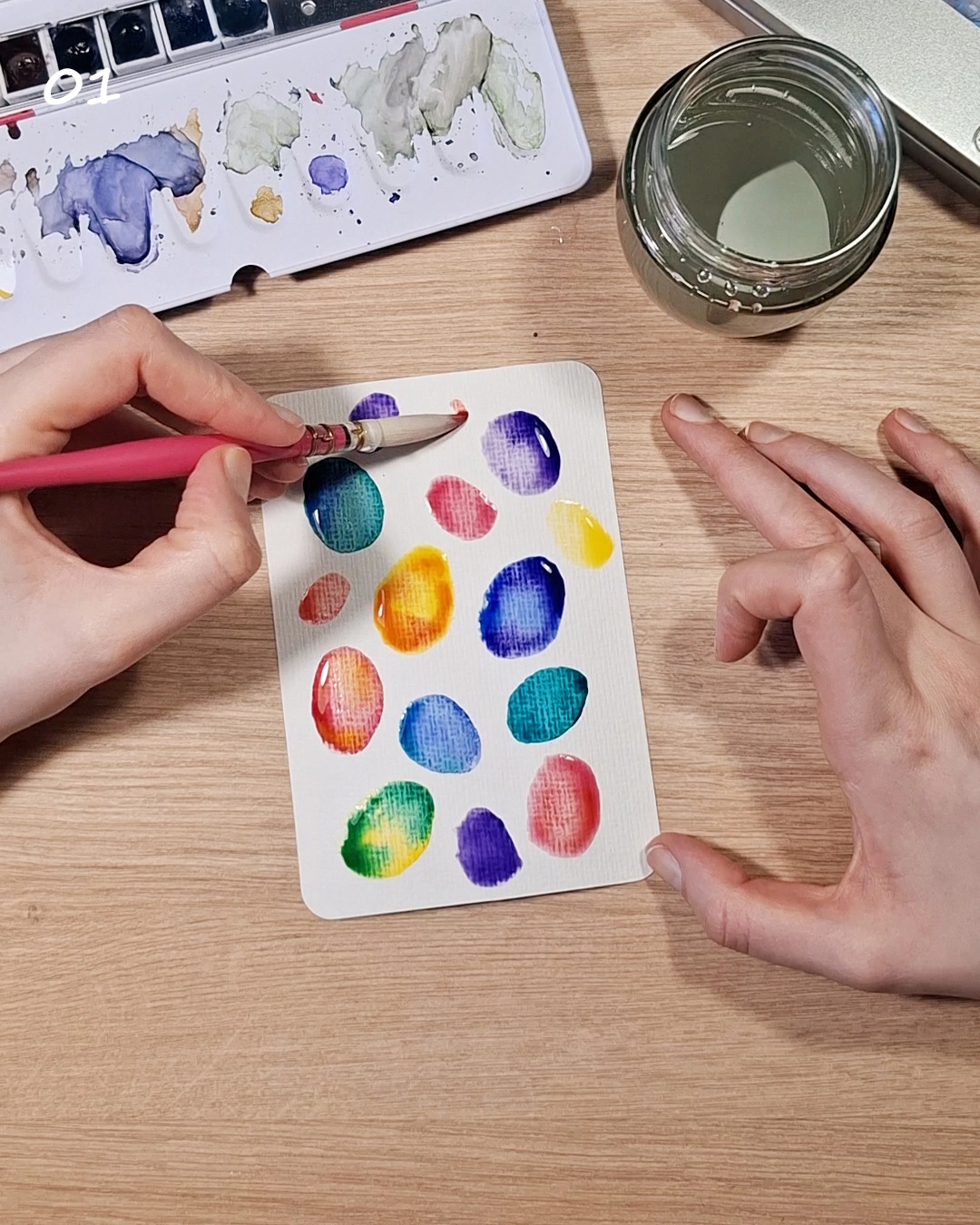 01) Male mit einem großen, weichen Pinsel bunte Eier auf die Karte.