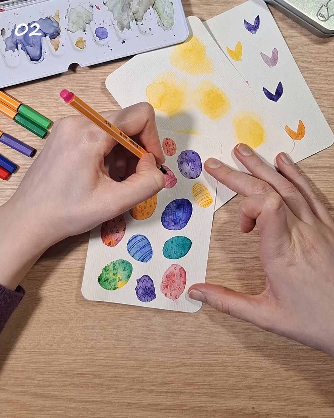 02) Wenn die Eier getrocknet sind, zeichne mit Finelinern Muster in die Eier: zum Beispiel kleine Pünktchen, Dreiecke, Herzchen, Streifen, Wellen oder Zickzacklinien.
