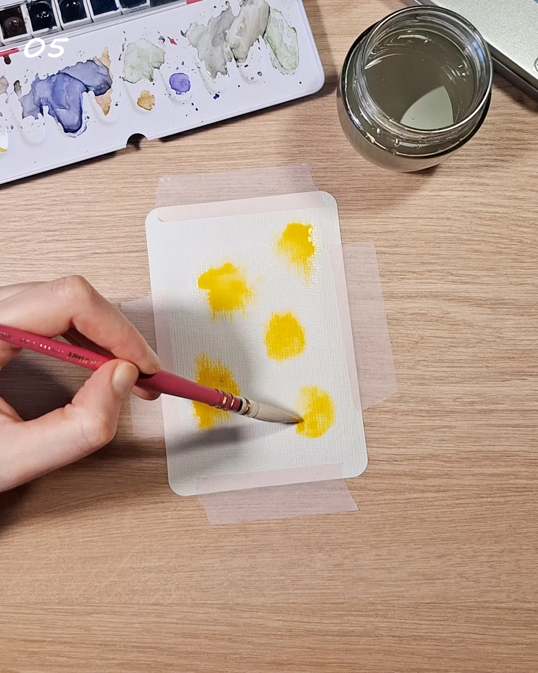 05) Verteile mit viel Pigment gelbe Flecken auf der Karte. Achte dabei nicht so sehr auf die Form. Die Farbe verläuft im feuchten Papier, sodass die Küken extra fluffig werden.