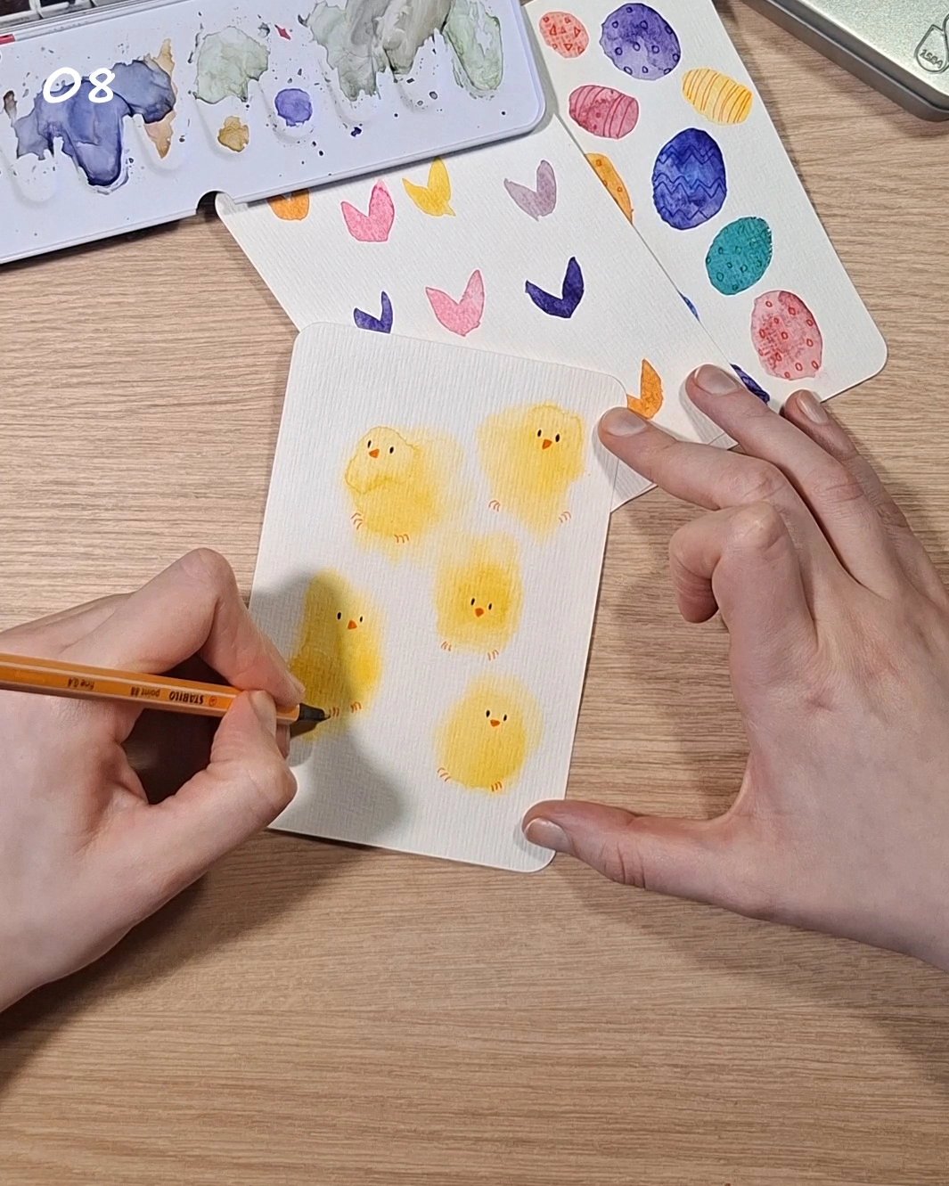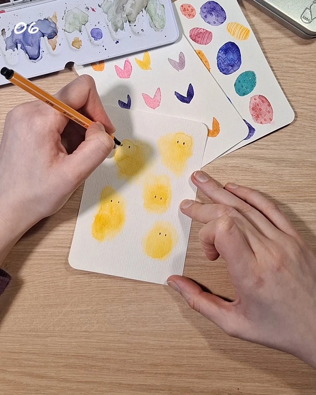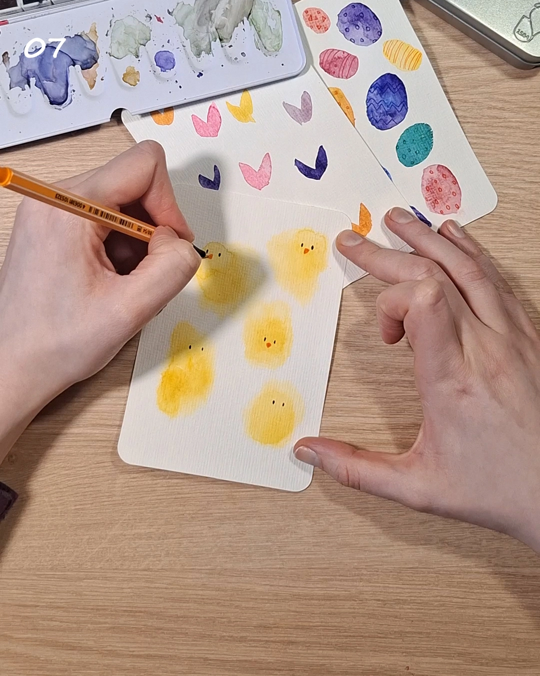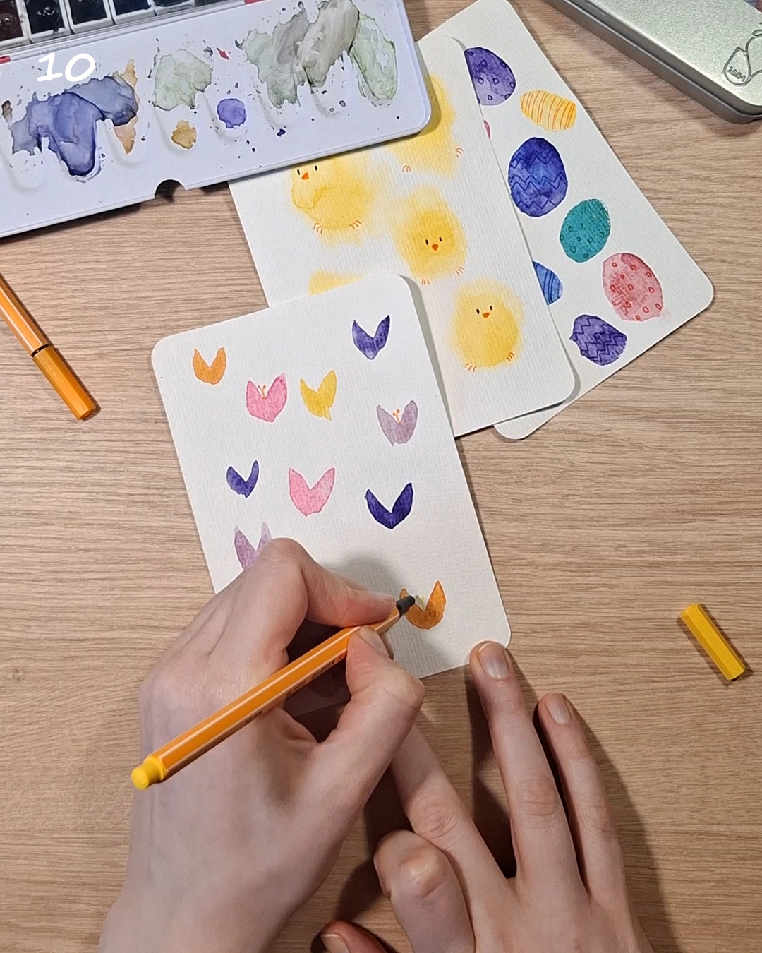 07) Zeichne mit einem orangen oder roten Stift jeweils ein kleines Dreieck unterhalb der Augen für den Schnabel. Du kannst dabei mit Drehung und Position des Dreiecks variieren, damit die Küken in verschiedene Richtungen schauen.