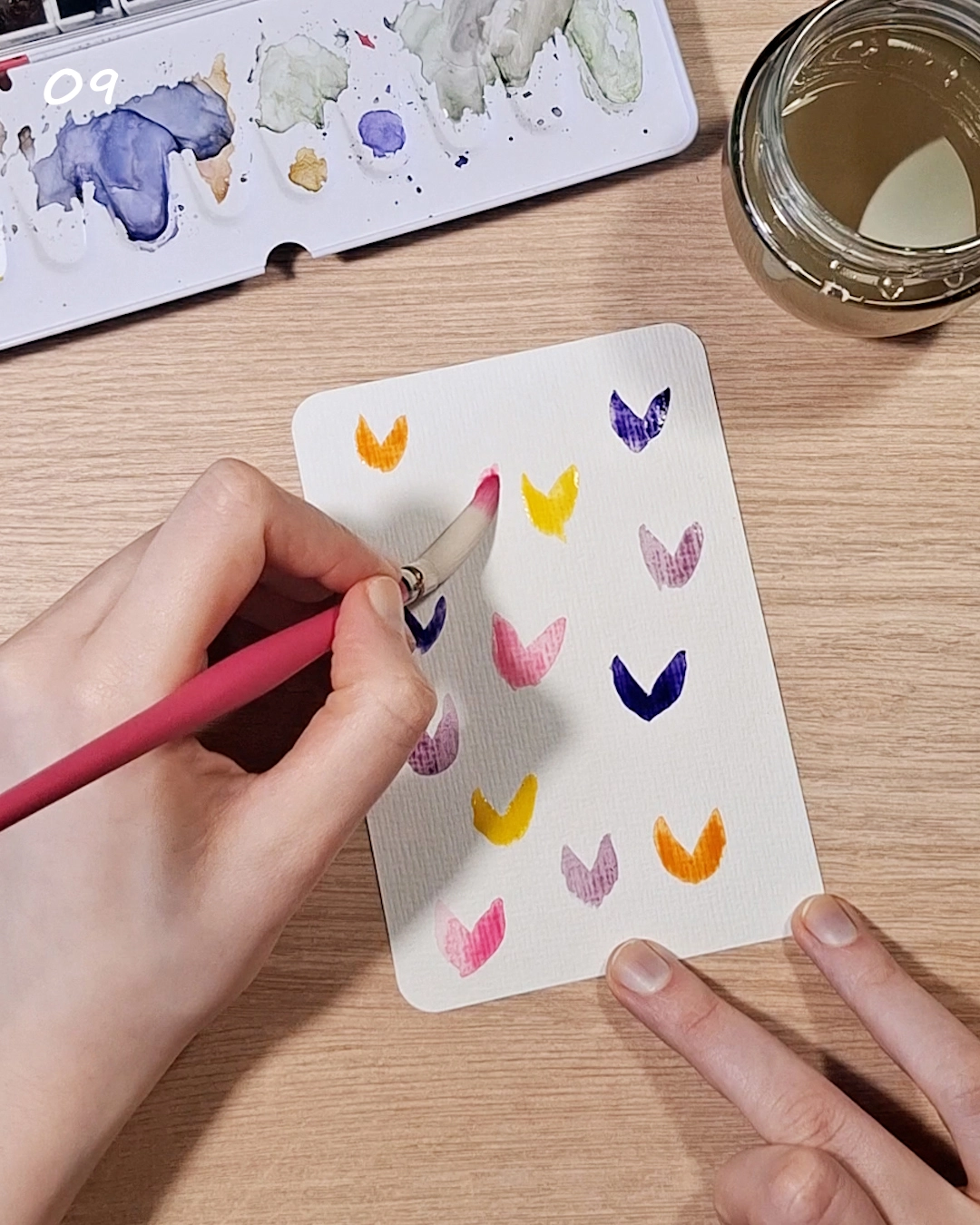 09) Male mit einem großen, weichen Pinsel V-Formen auf deine Postkarte. Du kannst dabei die Form des Pinsels nutzen, um die Farbe vorsichtig zu "stempeln".