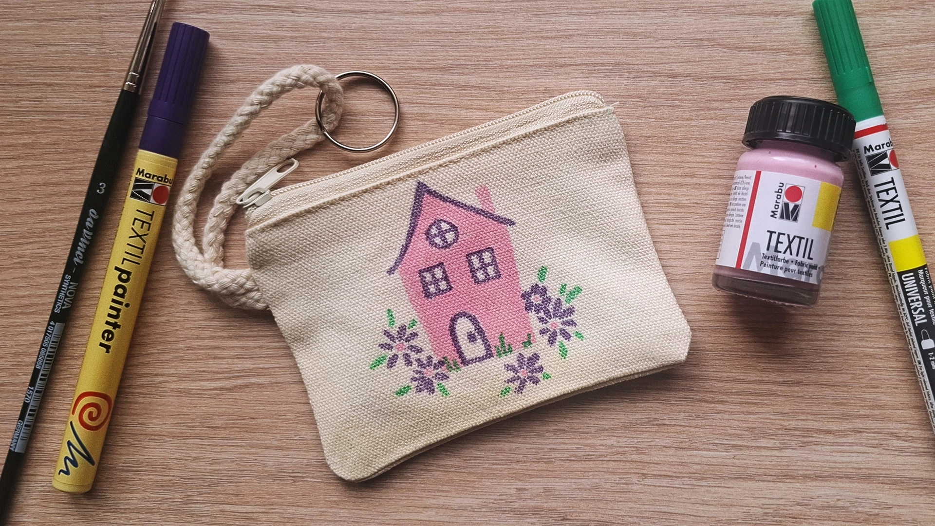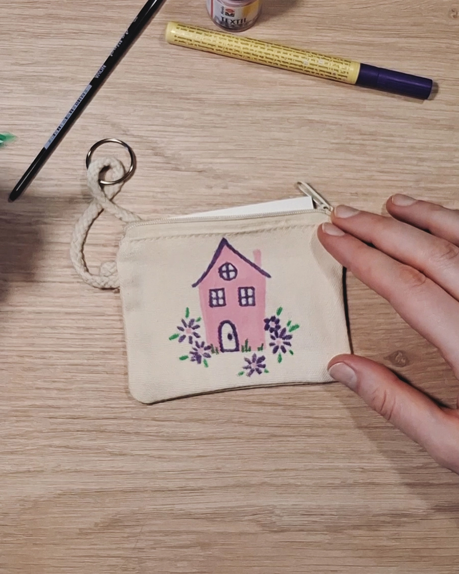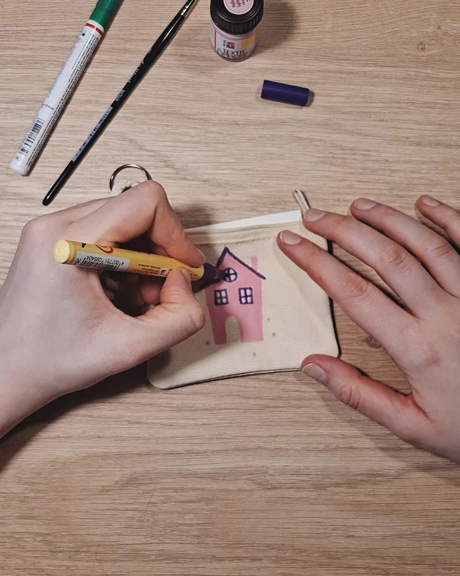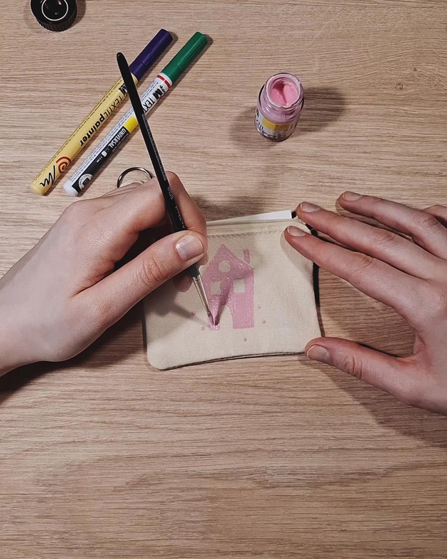 02) Male mit Rosa die Grundform des Hauses auf das Mäppchen. Je nach Stoffgewebe kann es sein, dass du mehrere Schichten oder die Farbe recht dick auftragen musst, damit die Fläche komplett deckend gefüllt ist. Platziere dann noch ein paar Pünktchen für die Blümchen.