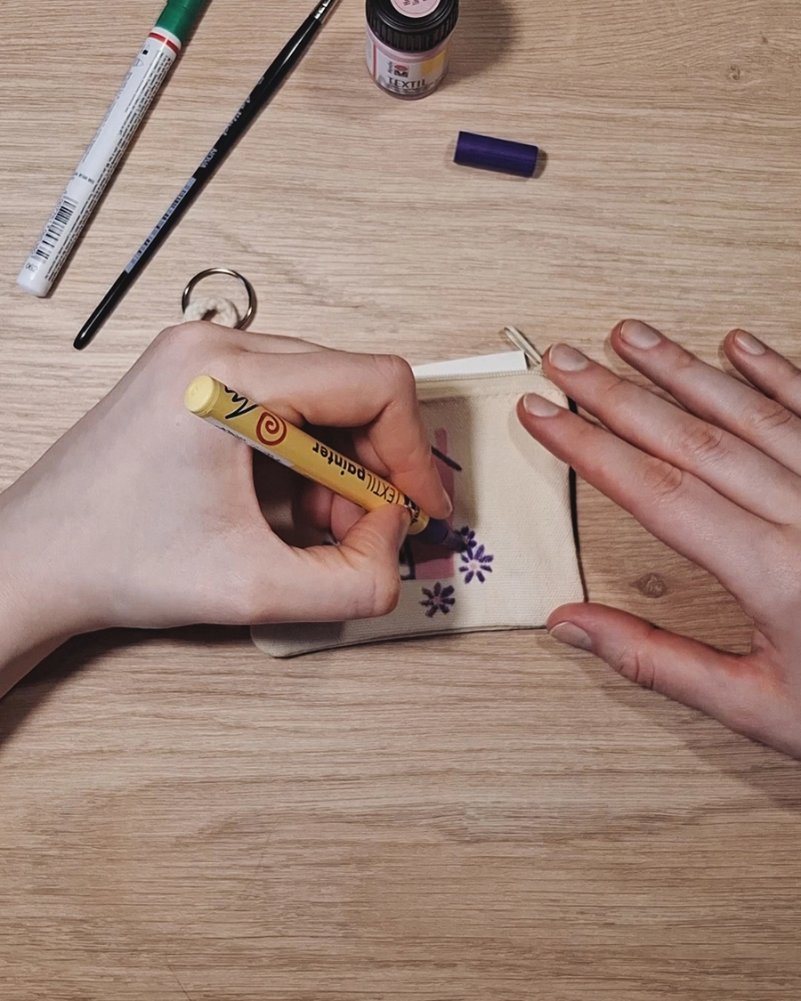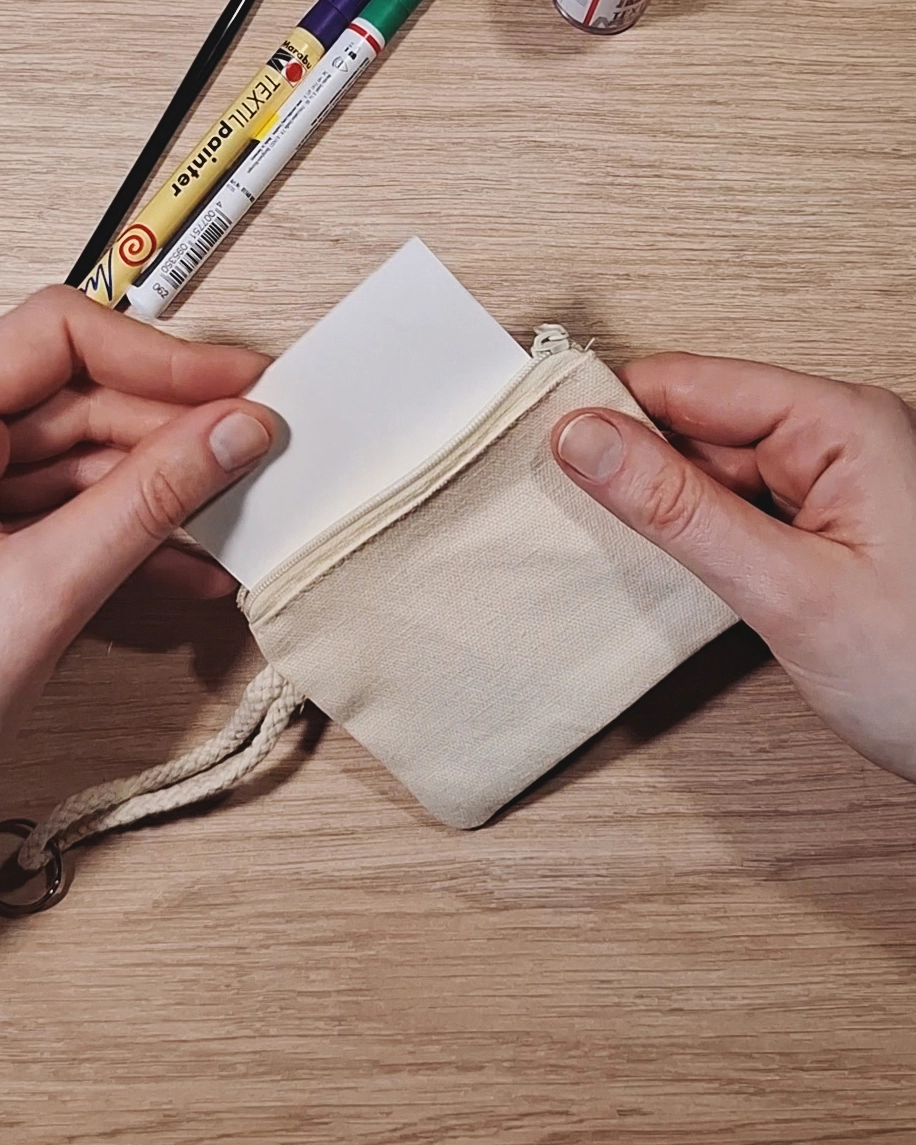 01) Da die Textilmalfarbe je nach Gewebe durchdrücken kann, stecke am besten vorsichtshalber ein Stück Papier in dein Mäppchen.