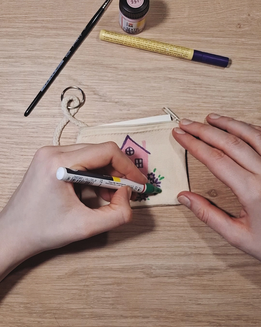 05) Mit dem Grünen Textilmalstift kannst du noch ein paar Grashalme und Blättchen zur Verzierung hinzufügen.
