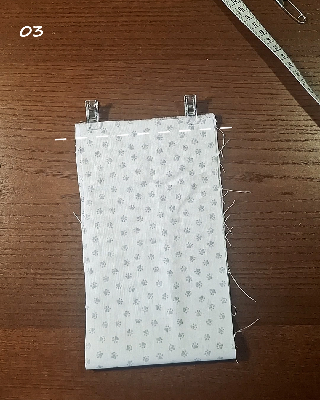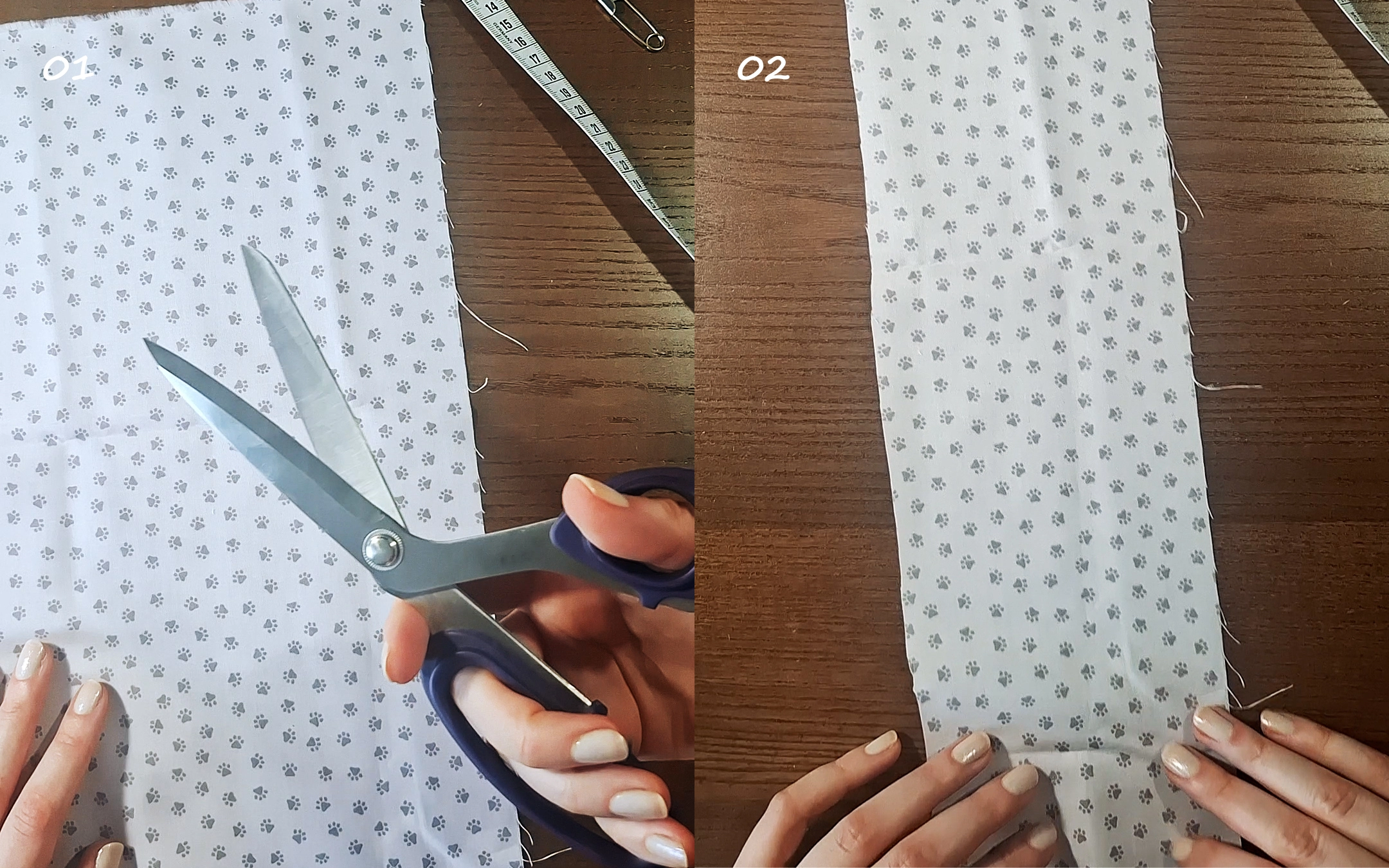 01-02) Schneide deinen Stoff zu. Wenn dein Stoffrest nicht exakt die passenden Maße hat, ist das gar kein Problem, du musst hier gar nicht so genau arbeiten.