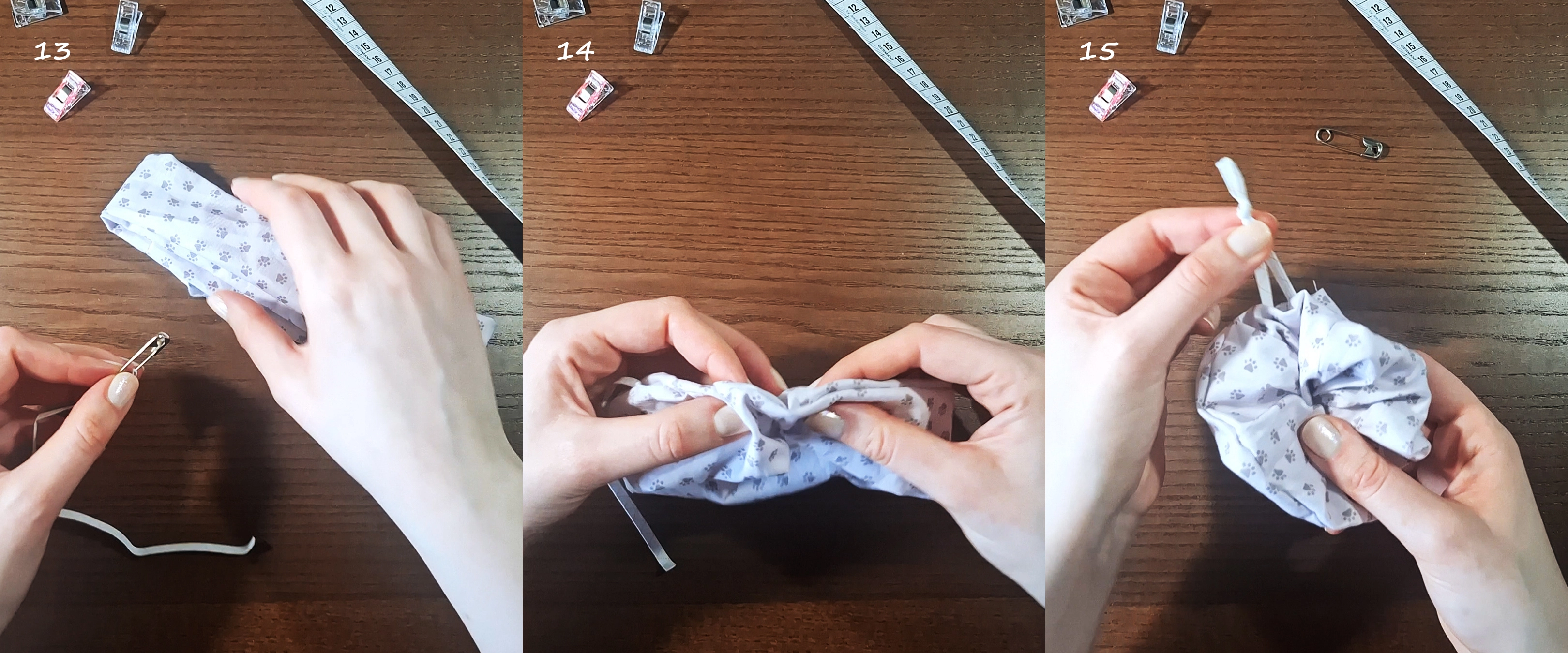 13-15) Schneide dein Gummiband zu, befestige es an einer Sicherheitsnadel oder Büroklammer und ziehe es durch das Scrunchie. Knote die Enden fest zusammen und zupfe das Scrunchie etwas zurecht.