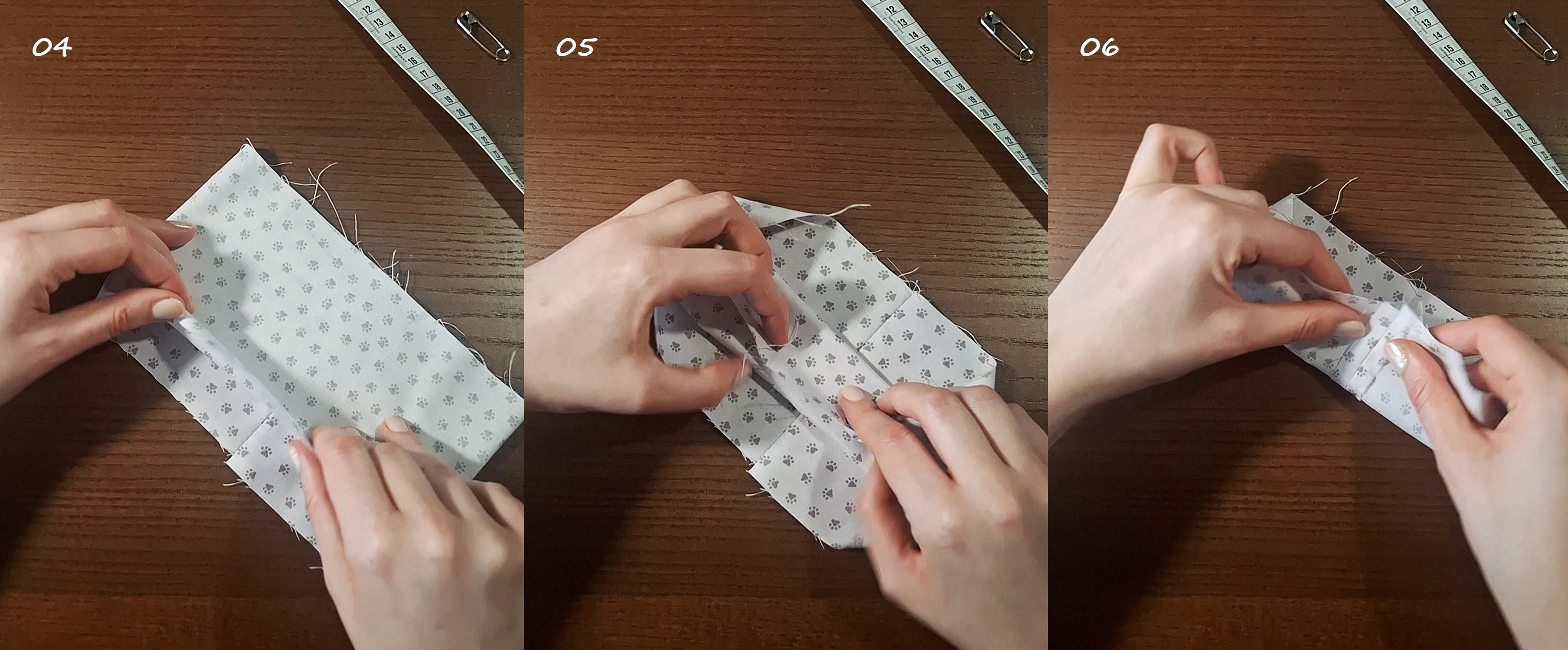 04-06) Lege das Nähstück mit der Naht nach unten vor dich. Jetzt legst du die obere Stoffschicht so eng es geht zusammen und faltest die untere rechts auf rechts darum herum, sodass die lange Kante und die Enden der Quernaht aufeinander liegen.