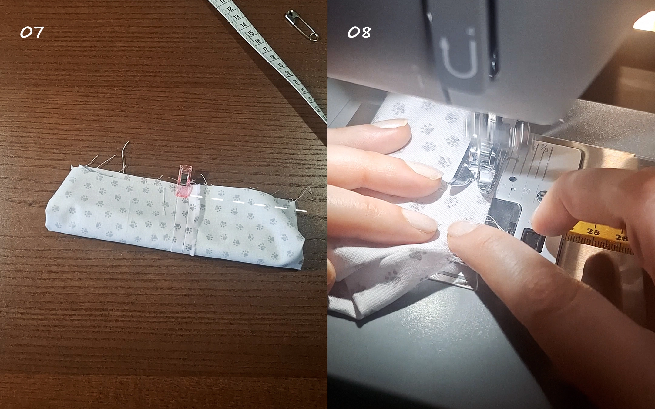 07-08) Jetzt kannst du die Längskanten des Scrunchies mit 1 cm Nahtzugabe zusammennähen.