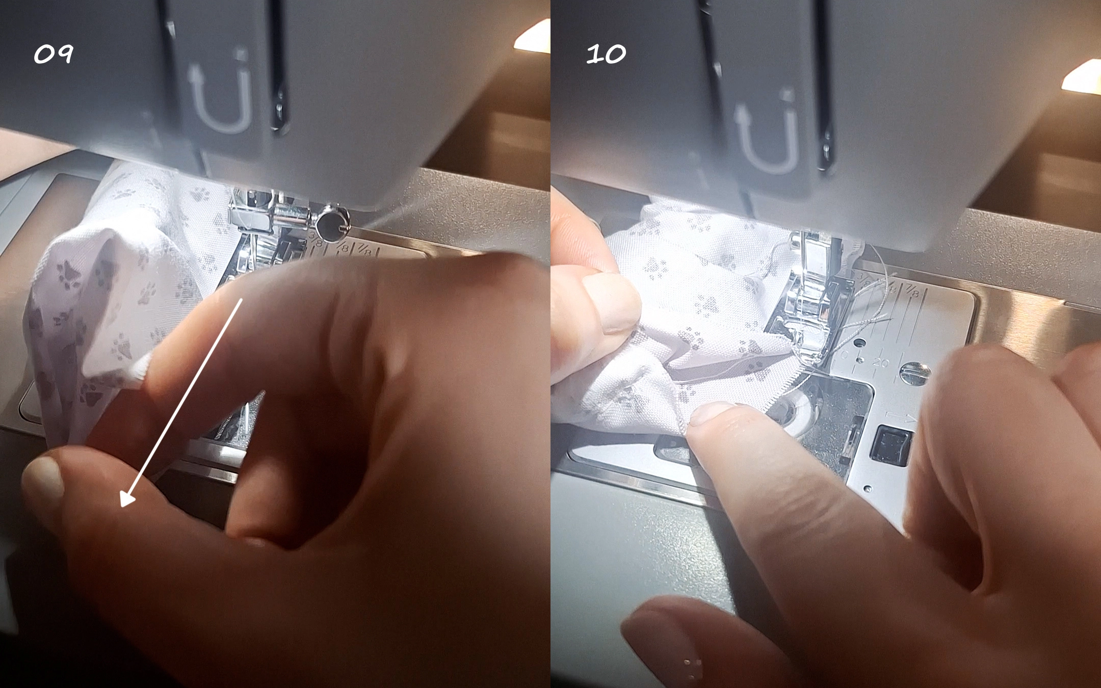 09-10) Beim Nähen ziehst du den innenliegenden Teil immer weiter heraus und nähst die Längskante zusammen, bis du ca. 3 cm vor der Quernaht deine Naht mit einem Rückstich beendest um eine Wendeöffnung zu lassen.