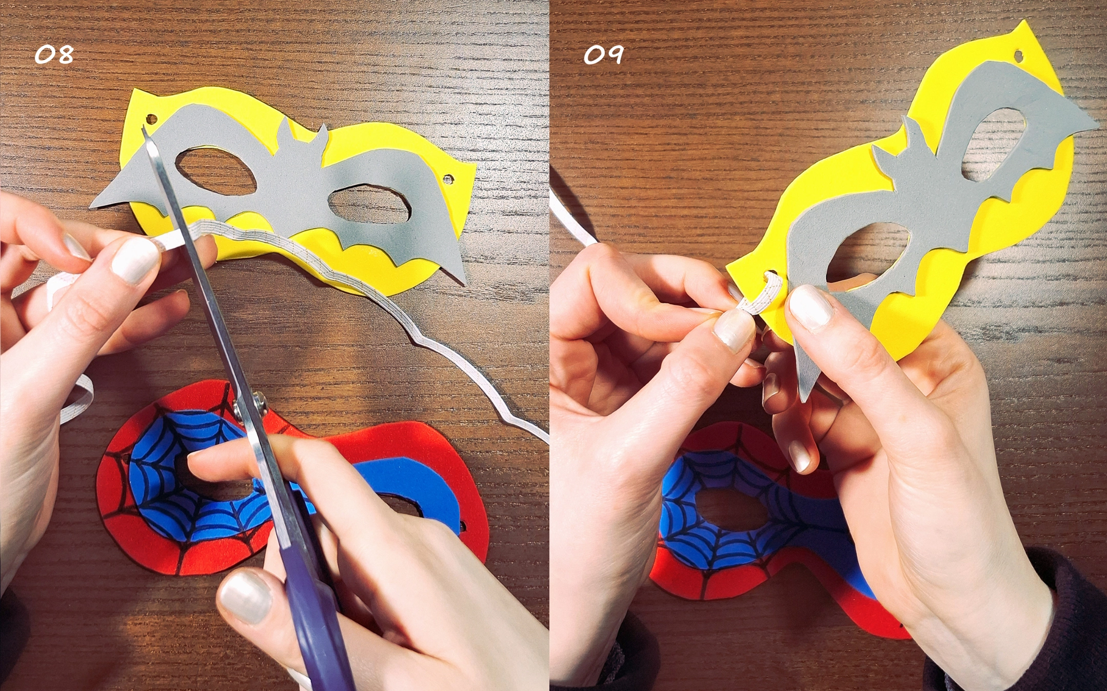 08-09) Schneide das Gummiband so zu, dass es angenehm um deinen Kopf passt (am besten rechnest du 4-5 cm für die Knoten dazu) und knote es an der Maske fest. Die überschüssigen Enden kannst du abschneiden.